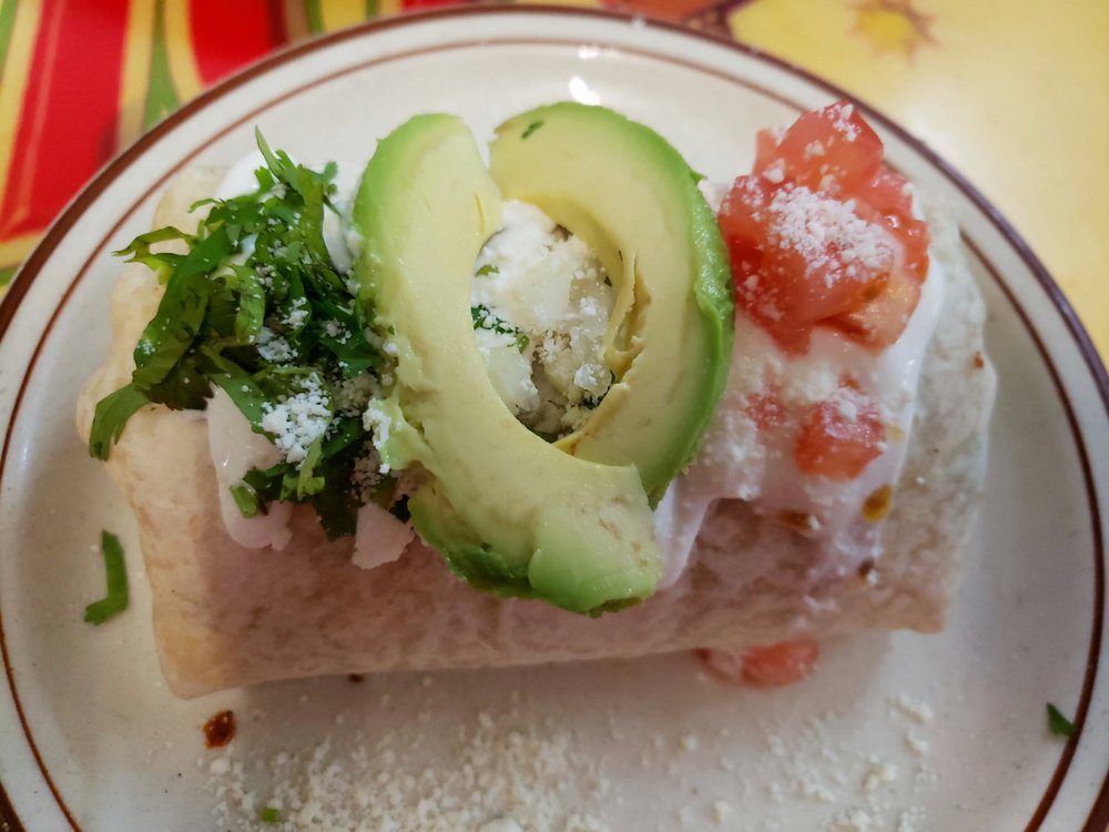 Vegetable. Flour tortilla stuffed with onions, tomatoes, cilantro, cheese with sour cream topped avocado and cotija cheese. Served with choice of rice, beans or salad and french fries.