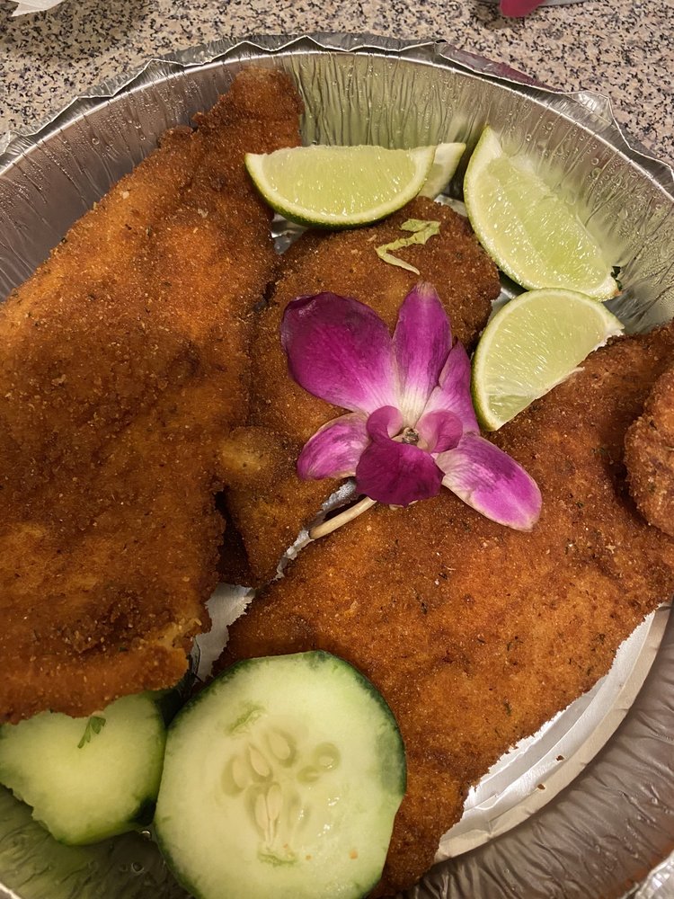 Baked porgie. Served with rice, refried beans, corn tortilla or salad and french fries.